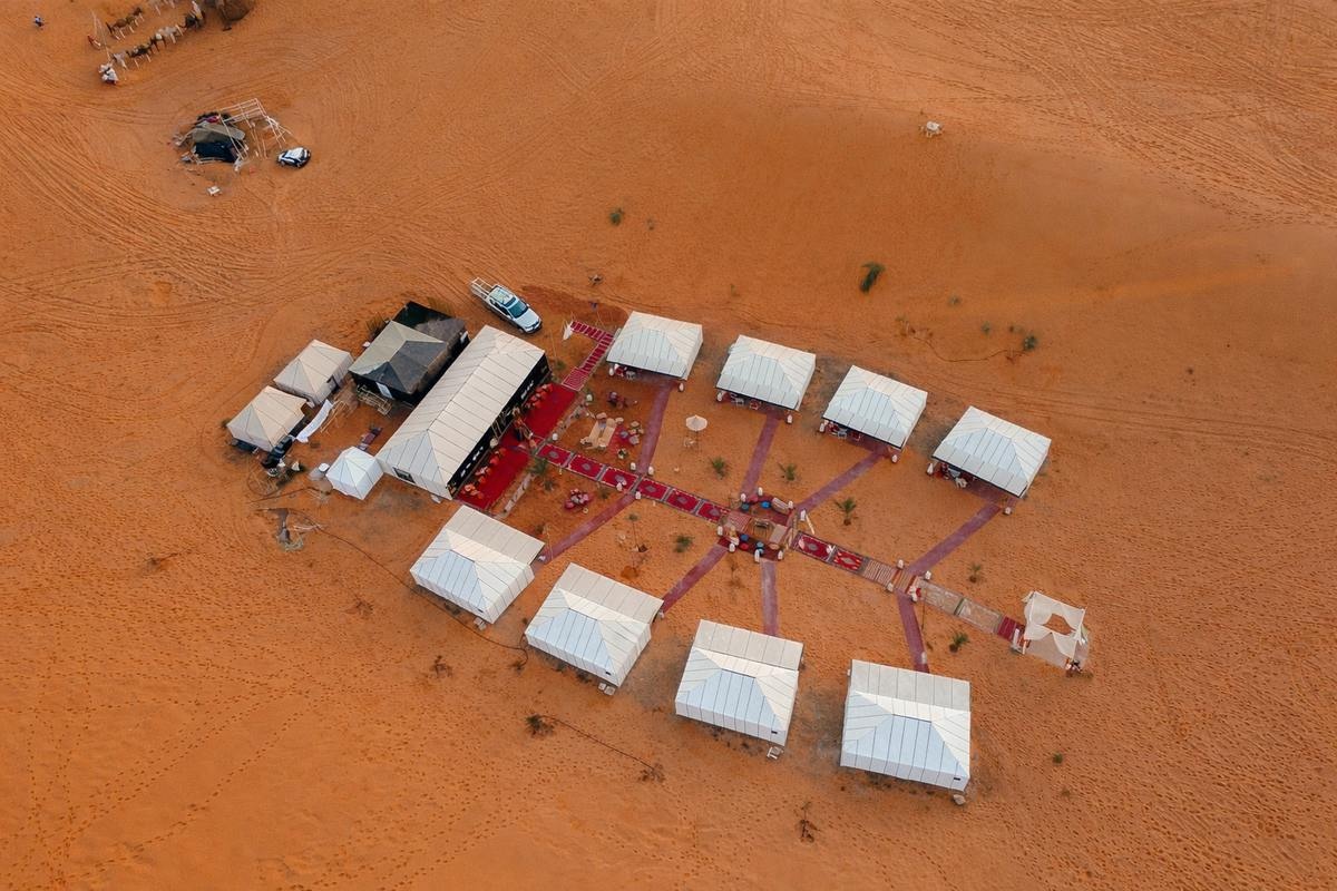 Composed of elegant tents and suites, each with a king-size bed, a comfortable lounge area, and a private bathroom with a hot shower and toilet, the camp offers a luxurious and intimate desert experience. Guests can watch the sunset over the dunes and enjoy a delicious breakfast, lunch, and dinner crafted to delight every palate.