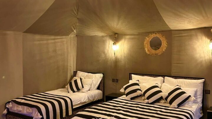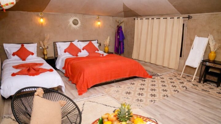 At Merzouga Luxury Desert Camp, we offer a unique and luxurious experience in the heart of the Sahara Desert. We provide distinct options: our Main Camp and our Private Luxury Camp. Both camps feature spacious, elegant tents with stunning views of the Erg Chebbi dunes, combining modern comfort with authentic Moroccan charm. Our guests can enjoy fine dining, personalized service, and a range of activities, including camel treks and desert excursions. Whether you choose our Main Camp for a traditional desert experience or our Private Luxury Camp for a more secluded retreat, we guarantee an unforgettable journey into the magic of the Sahara.